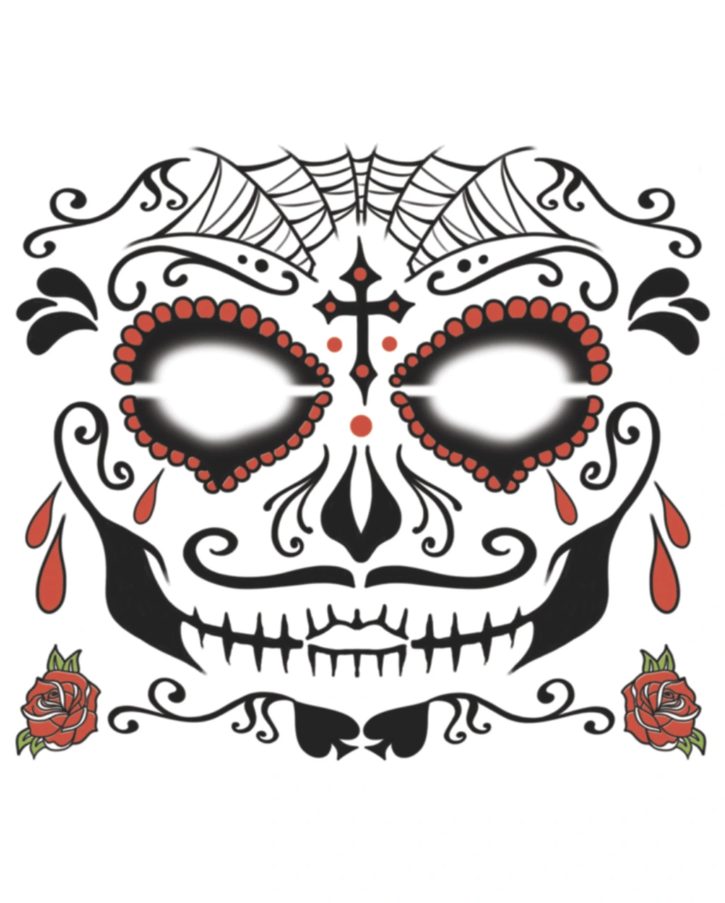 Werde mit dem Face Tattoo Sugar Skull männlich zum genial geschminkten Day of the Dead Gentleman. Deinem perfekten Totenkopf Gesicht kann am Tag der Toten niemand widerstehen. Die Sugar Skull Bräute werden sich darum reißen, mit dir in den Sarg zu springen. Deshalb hast Du auf der nächsten Halloween Fete auch ein leichtes Spiel.
