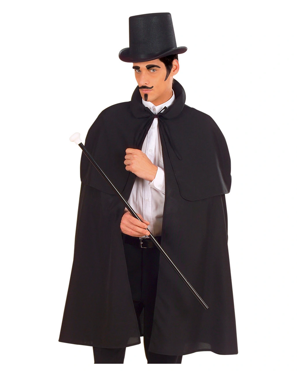 Der schwarze Karnevalsumhang ist knielang und hat ein Schulter Cape und Stehkragen. Das passende Kostüm Accessoire zu dem edlen Gentlemen Umhang ist der Spazierstock mit Totenschädel und der Zylinder schwarzer Filz Gr. L aus dunserem Horror-Shop.