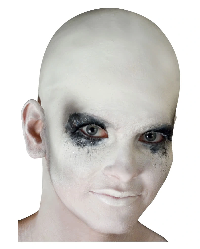 Die weiße Glatzenfolie ist aus weichem Latex und kann einfach mit Hautkleber an deinem Kopf befestigt werden. Die weiße Glatzenfolie mit extra dünnen Rändern wird über den Kopf gestülpt und nach Bedarf zugeschnitten. Bei langen Haaren empfiehlt es sich, diese zuvor mit einem Perückenstrumpf oder Haargel zu bändigen. Die Übergänge zur Haut werden mit dem Mastix Hautkleber groß fixiert. Die Ränder und Übergänge, jetzt am besten noch mit Flüssiglatex bestreichen. Damit kaschierst du die Übergänge und sorgst für zusätzlichen Halt der Glatzenfolie. Um die Kontraste zu deiner natürlichen Hautfarbe verschwinden zu lassen, schminkst du dich am einfachsten mit dem Aquacolor Weiss 30ml. Den bleichen Glatzkopf kannst du perfekt zu Verkleidungen wie Skelett, Sensenmann oder Alien kombinieren.