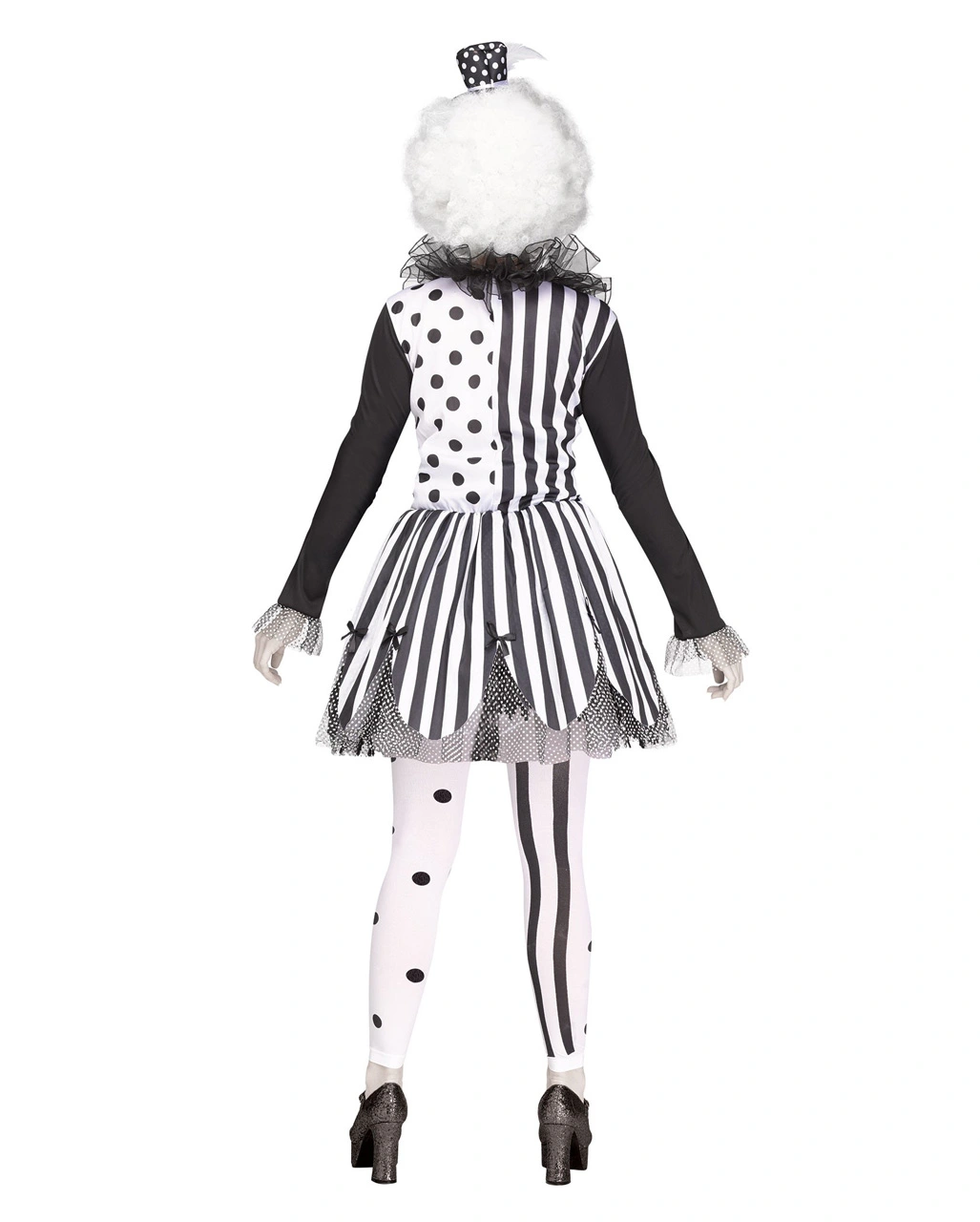 Das Horror Clown Damenkostüm besteht aus einer weißen Nylon Leggins mit schwarzen Punkten, einem gepunkteten Mini-Hut mit Federn und Diamant-Brosche, der an einem Haarreifen befestigt ist, und einem Kostümkleid. Das kurze Kleid hat lange Ärmel und schwarzen Tüll mit weißen Punkten als Unterrock. Es ist ein mehrlagiger Rock mit Gummiband für optimalen Halt. 2 große schwarze Bommel an der Front sowie ein 2-lagiger Clown Kragen der sich im Nacken mit Klettverschluss zumachen lässt, sorgen für die typische Harlekin Optik. Kombiniere dieses Halloween Clownskostüm für Damen mit passenden Artikeln aus unserem Sortiment. Z.B. Horror Clown Kinderkostüm für dein Kind, und Killer Clown Kostüm für Herren.