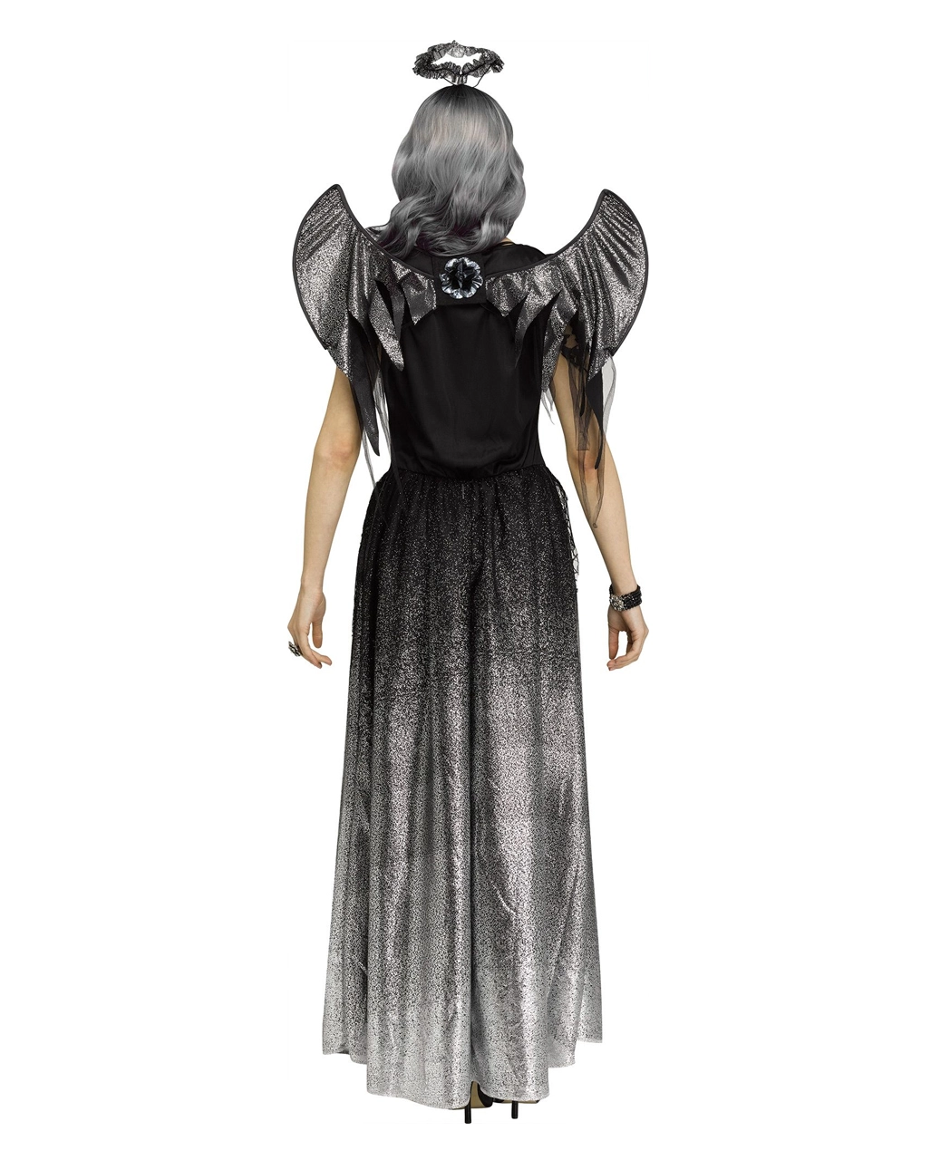 Ob Todesengel Verkleidung oder liebliches Halloweenkostüm der besonderen Art, unser Onyx Engel Damen Kostüm ist wie geschaffen für deine dunkle Seele. Das wunderschöne Kostümkleid zaubert durch sein Dreieck aus silbernem Glitzerstoff eine besonders hübsche Taille. Das lange fließende Kleid sorgt durch seine Übergänge von Schwarz ins Silbergraue für eine elegant-düstere Erscheinung. Die schwarzen Flügel und der silberne Heiligenschein komplettieren das Kostüm-Set des dunklen Engels.