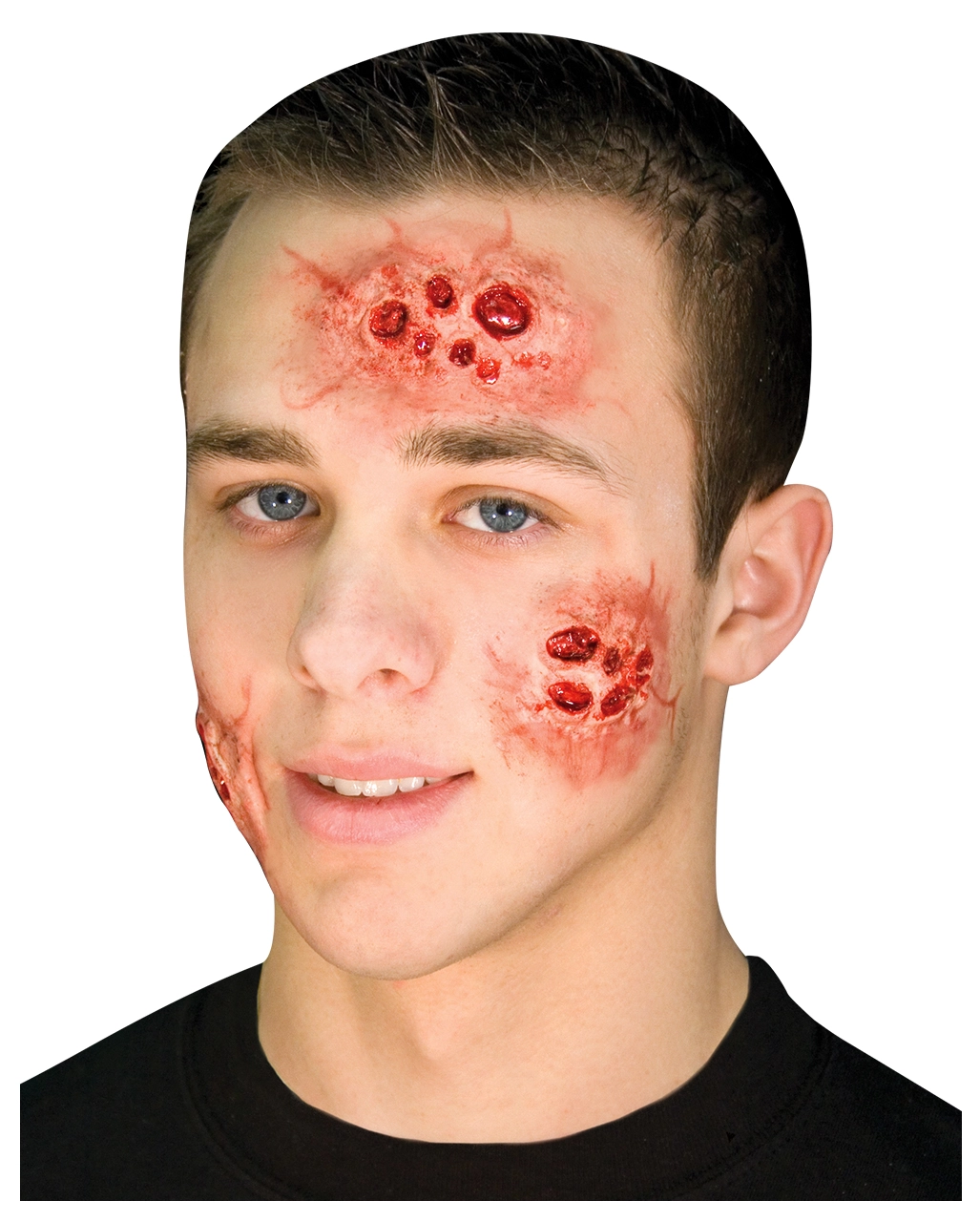 Historische Filme die das Thema Mittelalter als Kulisse haben, zeigen oft entsetzlich entstellte Pestopfer, die in Kutten und Decken gehüllt, nur bei Dunkelheit das Haus verlassen, um von irgendeinem schrulligen Quacksalber Hilfe zu erhoffen. Der krasse Ekelfaktor siegt bei dieser Wunde. Ob als Zombie, Geistesgestörter oder Pestopfer zu Halloween oder Historischem Event, mit dieser Hautirritation, bestehend aus drei einzelnen Wunden hat man den perfekten Auftritt.