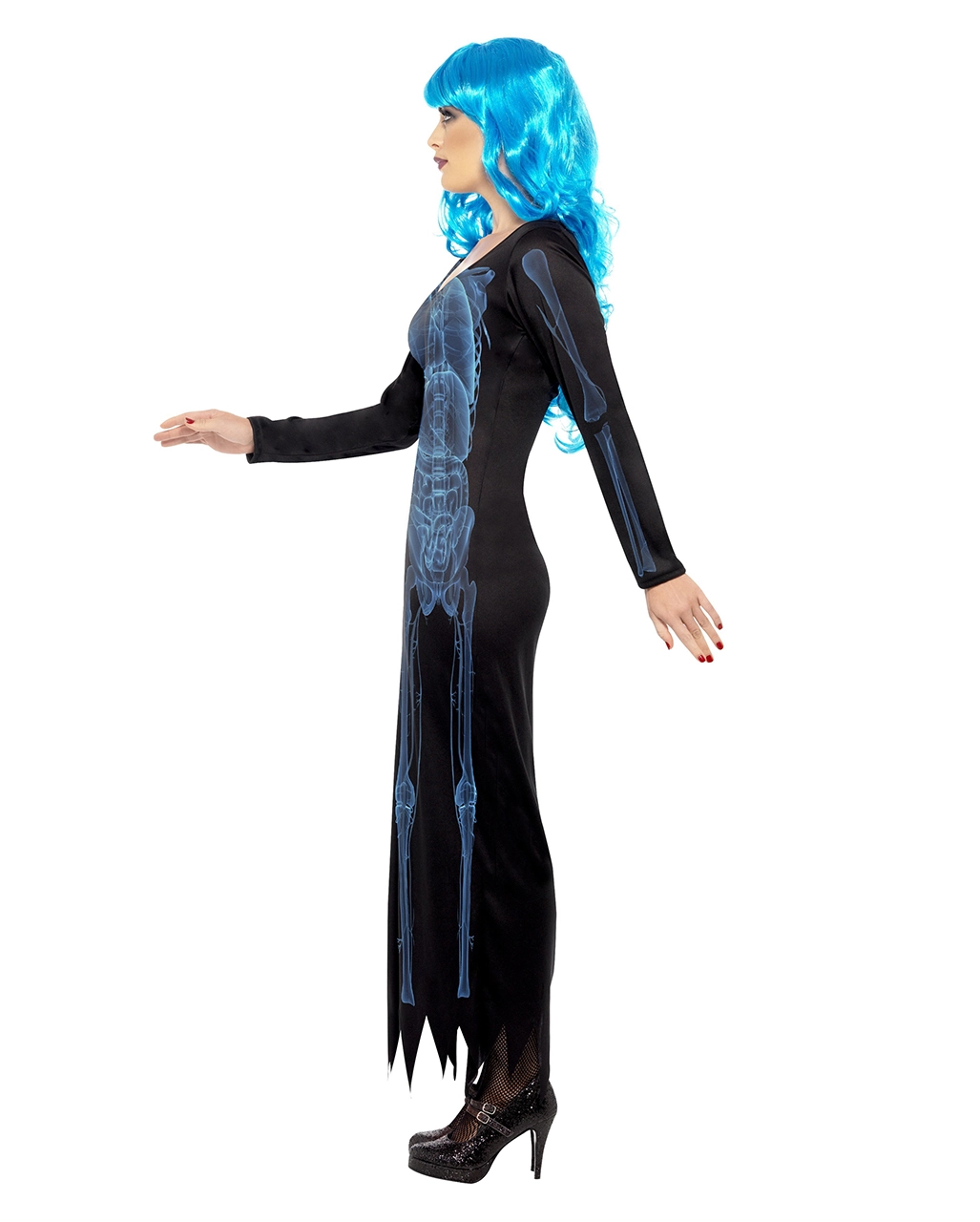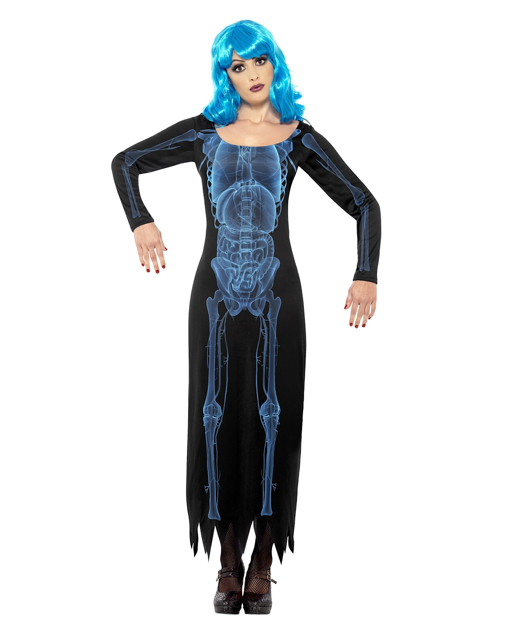 Das Röntgen Damen Kostüm ist ein schwarzes, langes und eng anliegendes Kleid mit dem Aufdruck einer Ganzkörper-Röntgenaufnahme. Das Kleid geht bis zu den Knöcheln und hat unten einen gezackten Saum. Der Aufdruck ist in einem hellen, transparent wirkenden Blau-Grau, wie es für Röntgenaufnahmen typisch ist,und zeigt neben den Knochen auch innere Organe und die wichtigsten Adern. Mit je einem Paar Skelett High Heel und Deluxe Skelett Handschuhe sowie der Skull Schaumlatex Maske kannst du den Durchblick noch verbessern.
