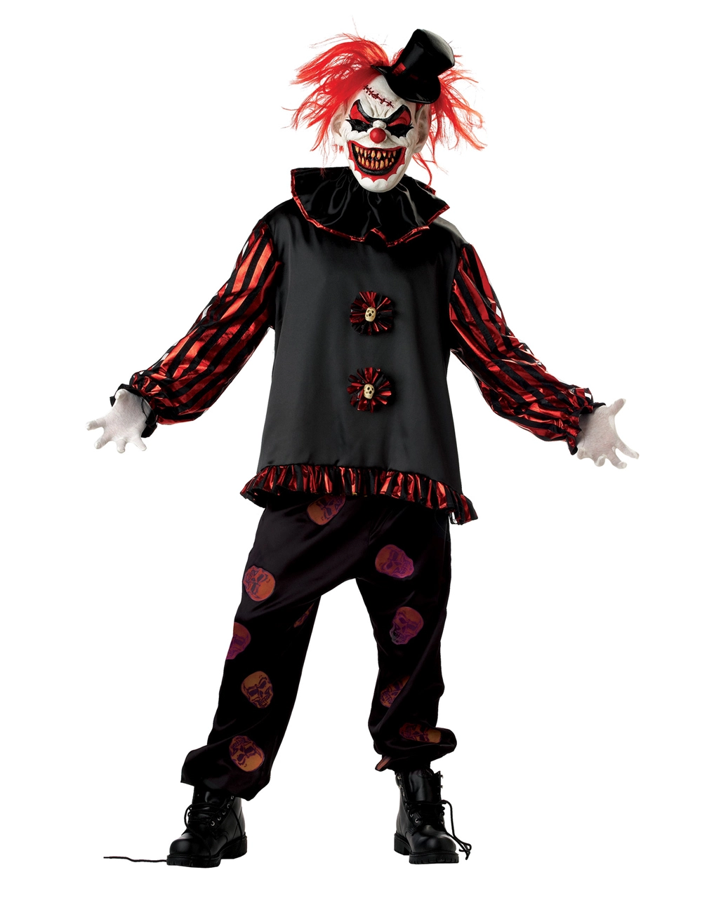 Das Horror Clown Kostüm von “Schlitzer der Clown” ist komplett ausgestattet und kommt inklusiv der gruseligen weißen Clownsmaske mit dem teuflischen Grinsen, den feuerroten Haaren und dem creepy, kleinen Zylinder. Die Clownmaske hat auf der Rückseite unter den Haaren ein Gummiband, das die Maske am Kopf hält. Das Horror Clown Kostüm selbst besteht aus schwarzem langärmligen Hemd mit Rüschen, Kragenkrause und der schwarzen mit Screenprint bedruckten Hose. Mit dem Clowns Kostüm bist Du garantiert eine der unheimlichsten Gestalten, die an Halloween die Straßen unsicher machen!