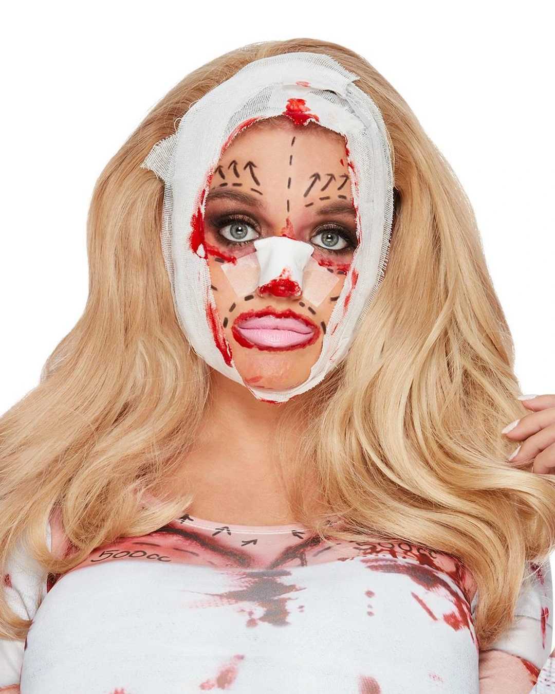 Das Schönheits OP Unfall Make Up Set verwandelt dich in ein Opfer einer blutigen missglückten Beauty OP. Das OP Make Up mit Bandagen enthält zusätzlich Aquacolor Schminke und einen schwarzen Stift. Eine detaillierte Schminkanleitung ist ebenfalls in deiner Lieferung enthalten. Trage hierzu das passende Verpfuschte Schönheits OP Patientin Kostüm 2-tlg.