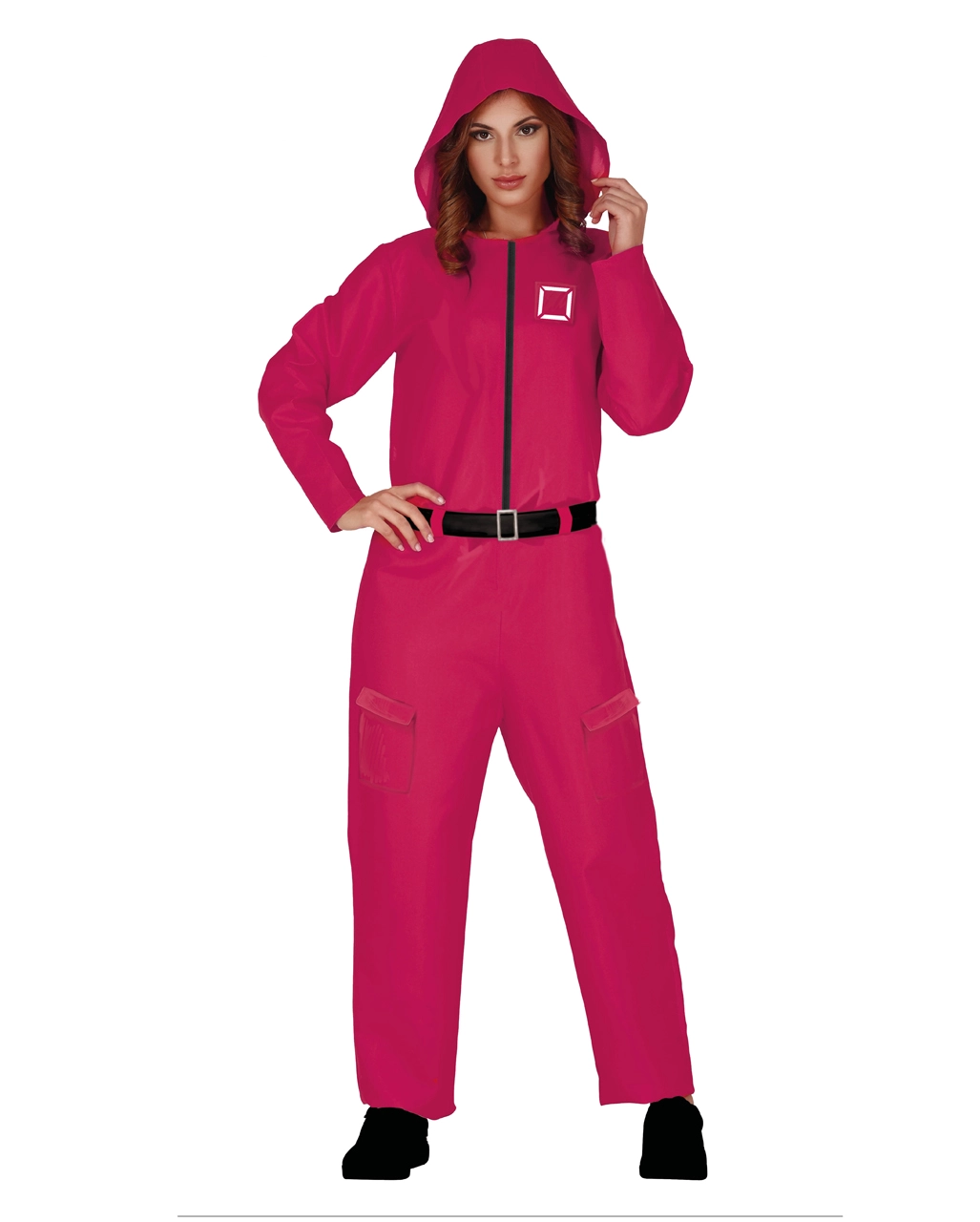 Das Squid Game Kostüm Aufseherin ist für Damen in S, M und L-Größe erhältlich. Der Squid Game Jumpsuit besteht aus reinem Polyester, liegt weich auf der Haut und fühlt sich sehr leicht an. An der Verkleidung befindet sich eine Kapuze. Kombiniere dieses Kostüm mit der Squid Maske Dreieck Deluxe. Fertig ist dein markanter Wärter-Look!