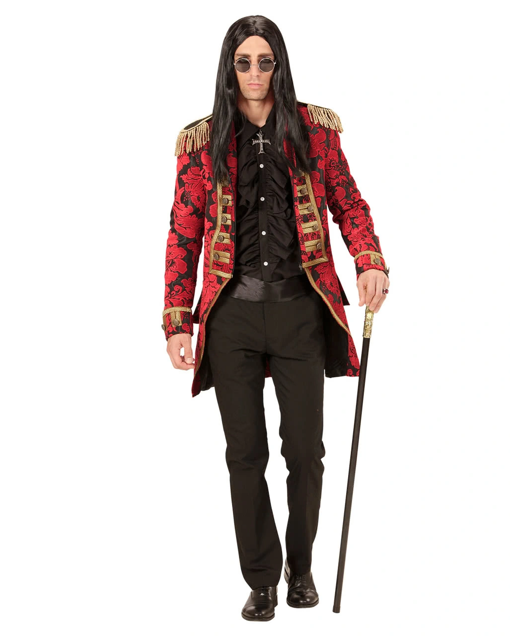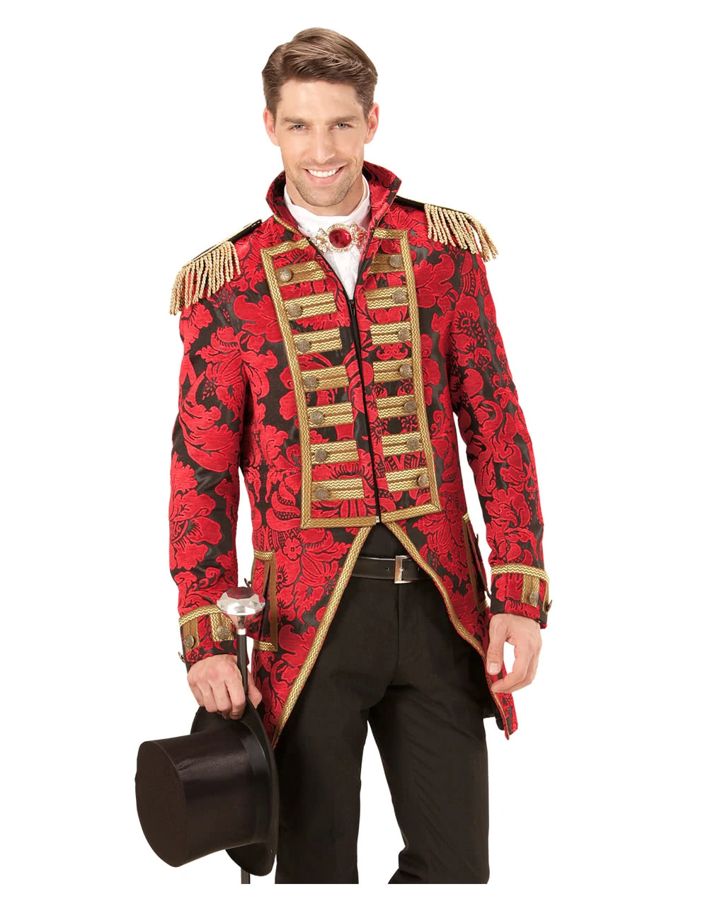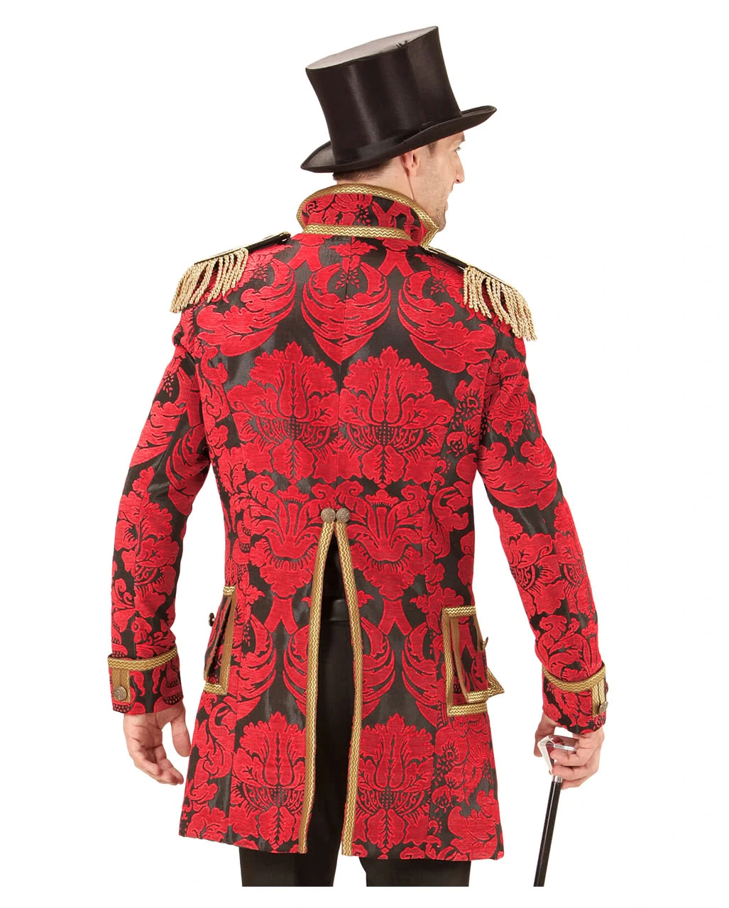 Der rot-schwarze venezianische Frack ist aus schwerem Stoff gearbeitet und besitzt ein wunderschönes florales Muster aus roter Stickerei auf schwarzem Stoff. Die Verzierung aus Goldborte, sowie die Metallknöpfe ergeben zusammen mit den Schulterklappen und deren Fransen den eleganten Gentleman Look.