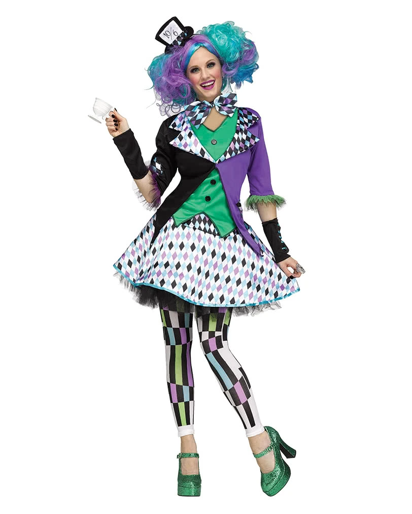 Das verrückte Hutmacherin Kostüm besteht aus einem Kostümkleid mit Tüllunterrock, 2 Armstulpen, einer Schleife für den Hals, einer Strumpfhose und einem Haarreifen mit Minihut, auf dem der Preis des Hutes (10 Shilling, 6 Pence) prangt. Das Halloween-Kostüm ist in den Farben lila, grün, schwarz, weiß und blau gestaltet mit tollen Satin und Tüll Details. Die schwarzen Kostüm Armstulpen haben eine blaue fake Schnürung. Dazu passen die Lack Pumps mit Poker Motiv und die Weiße Kaninchen Handtasche.