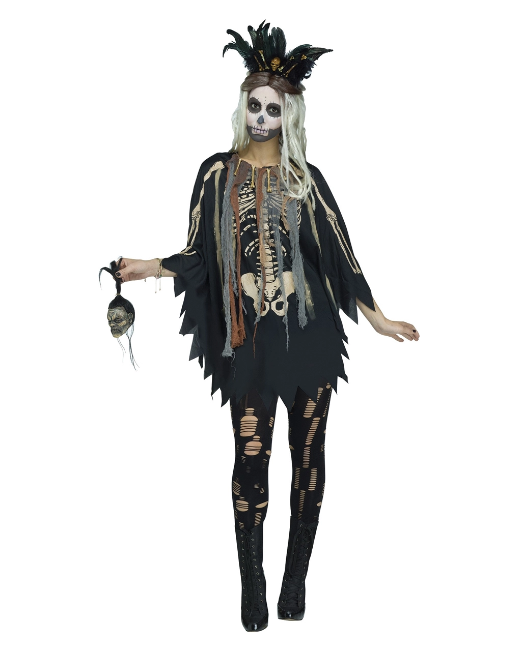 Als fieses Voodoo Hexenweib wirst Du Deinen Nachbarn an Halloween genau wie am Tag der Toten das Fürchten lehren. Wird bestimmt lustig zu sehen, wie sie vor Dir davonrennen. Und nur weil sie denken, es ginge nicht mit rechten Dingen zu, was sie da vor sich sehen. Mit dem Vodoo Skelett Kostüm-Poncho wirst Du am Dia de los muertos zur untoten Voodoo Hexe, die ihre alten Knochen noch ganz schön schnell bewegen kann. Mit diesem mega Auftritt als mysteriöses Skelettwesen wirst Du auf der Halloweenparty mächtig Spaß haben und auch an Fasching oder auf der Mottoparty für Nervenkitzel sorgen.