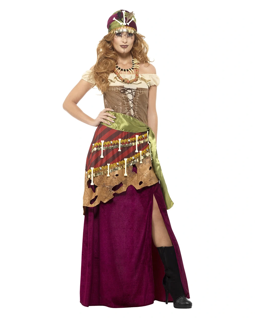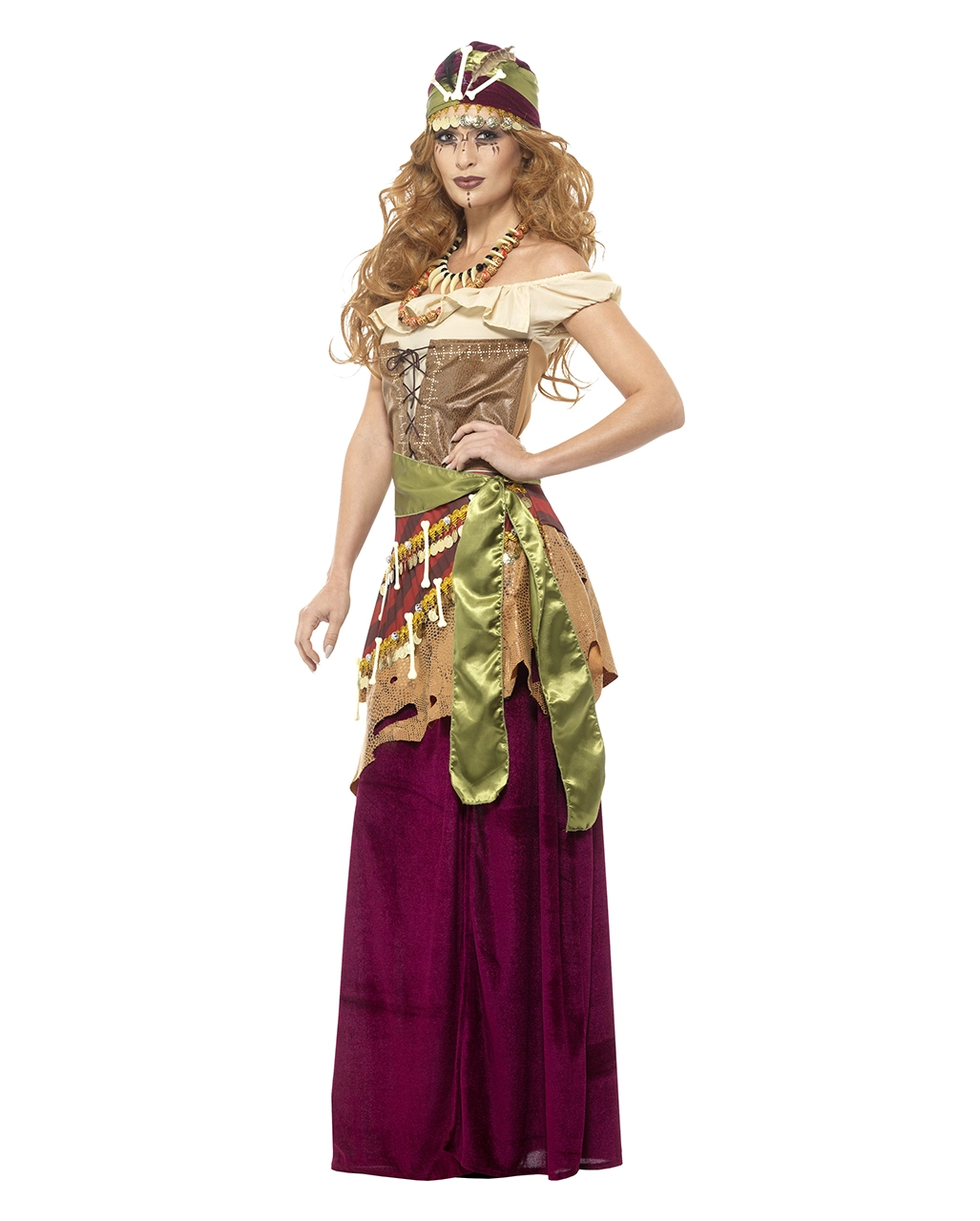 Das Voodoo Witch Damenkostüm Deluxe besteht aus einem weinroten Kostümkleid mit beigefarbenen Oberteil samt Schnürung in Leder-Optik und weiteren Verzierungen wie Goldmünzen, Knochenteilen und einer Rüsche in Kunstleder-Optik. Dazu gesellen sich eine Kette mit gemusterten Holzperlen, eine zweite mit Knochenteilen sowie eine Kopftuch mit Kunstfedern und eine grüne Schärpe. Dazu passt die Voodoo Priesterin Perücke und für den Herren das Voodoo Witch Doctor Kostüm Deluxe.