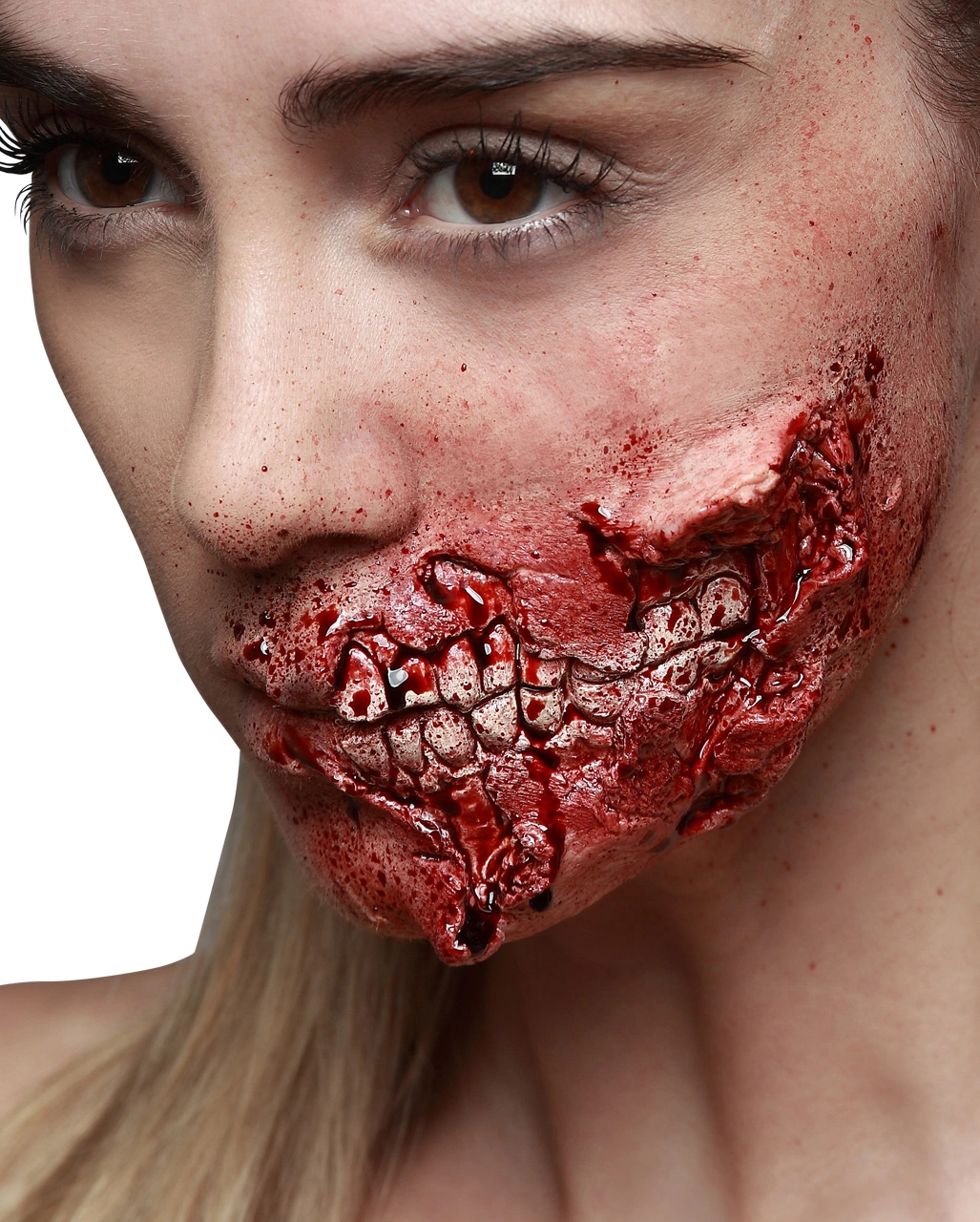 Ein filmreifes Spezial Make-up muss für Halloween und Zombie Walk richtig drastisch Aussehen! Was gibt es schlimmeres als eine von Zombies aufgerissene Backe, aus der zum Teil das blanke Kiefer zu sehen ist? Die riesige Fleischwunde zeugt von einem kräftigen Biss, der durch einen tollwütigen Zombie verursacht wurde. Die zerfetzte Backe, lässt einen Blick, auf die sich darunter befindliche Kauleiste zu und lässt einen Zahnarztbesuch dringend notwendig erscheinen.